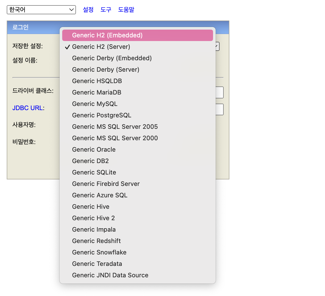 인메모리 모드를 사용할 것이기 때문에 Embedded가 아니라 Server로 선택해서 실행해야 한다.