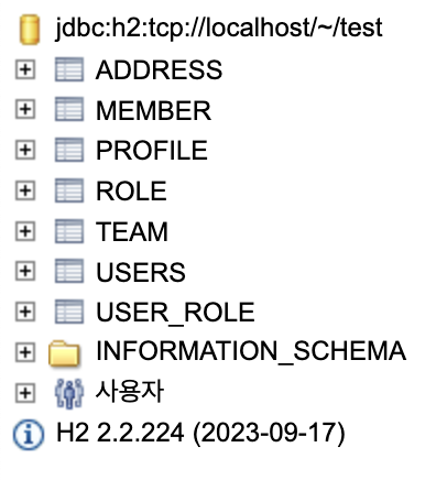 인텔리제이에서 코드를 작성한 후 실행하면 entity 클래스들이 테이블로 생성된 것을 확인할 수 있다.