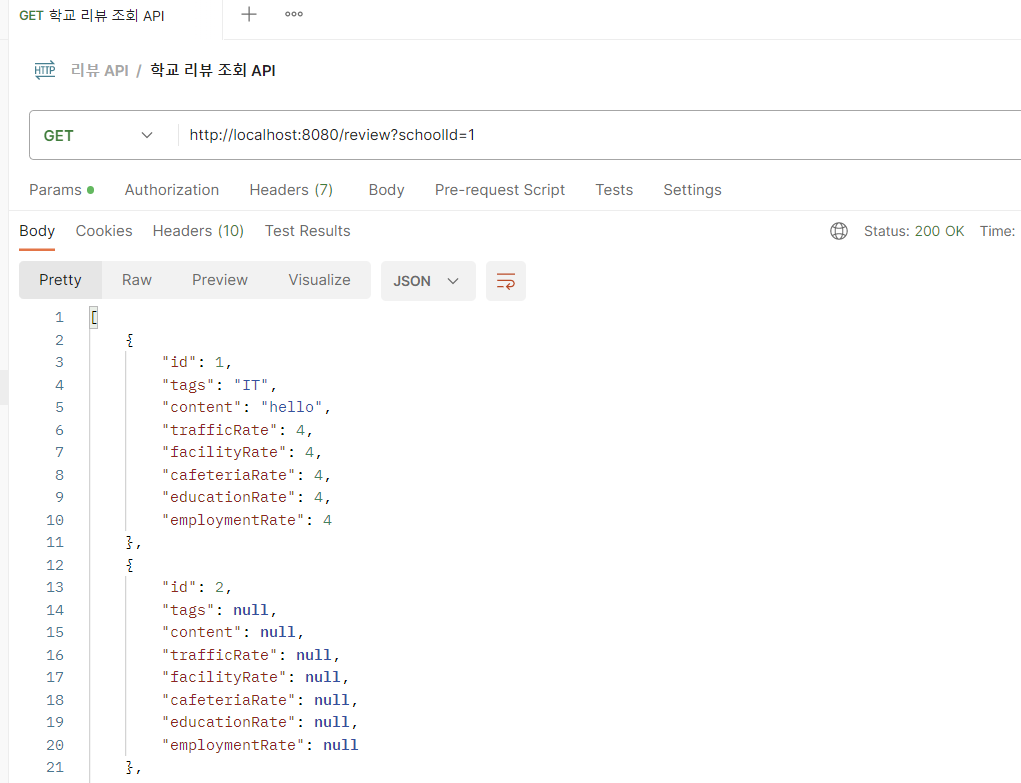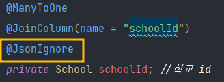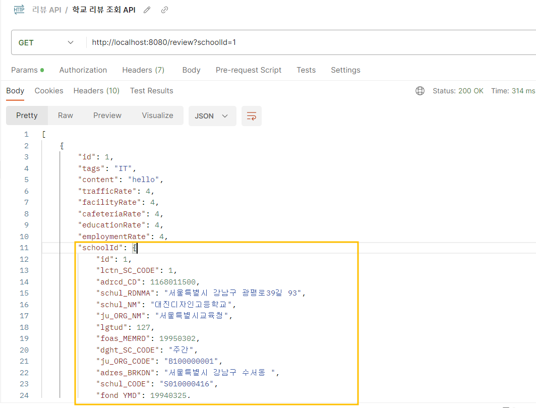 review 엔티티에 필요한 schoolId라는 속성이 school 테이블에 조인되어 있기 때문에 위와같이 id 값이 1번에 해당하는 불필요한 학교의 정보가 다 딸려나오게 되었다. school 테이블의 필드가 워낙 많다보니 생각보다 불편함을 느낄만한 상황이었다.