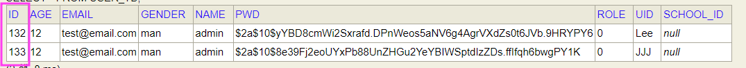 user 테이블을 확인해보니 핑크색 id 값을 빼고 나머지 값들은 모두 똑같은 값이 들어있었다.