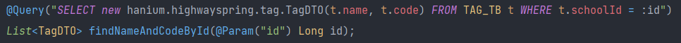 - tag 테이블에는 아래와 같이 4개의 칼럼이 있는데 프런트로 넘겨줄 때는 이 중 name, code만 필요.