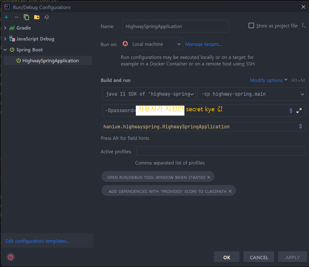 4-2) VM options에 "-Dpassword=your_secretkey "를 적어준다.