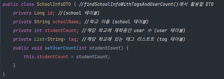 위에 코드에서 조회한 태그 목록을 schoolInfo 객체에 넣어준다. - Long userCount = queryFactory.select(user.id.count()).from(user).where(user.schoolId.id.eq(schoolInfo.getId())).fetchOne();
