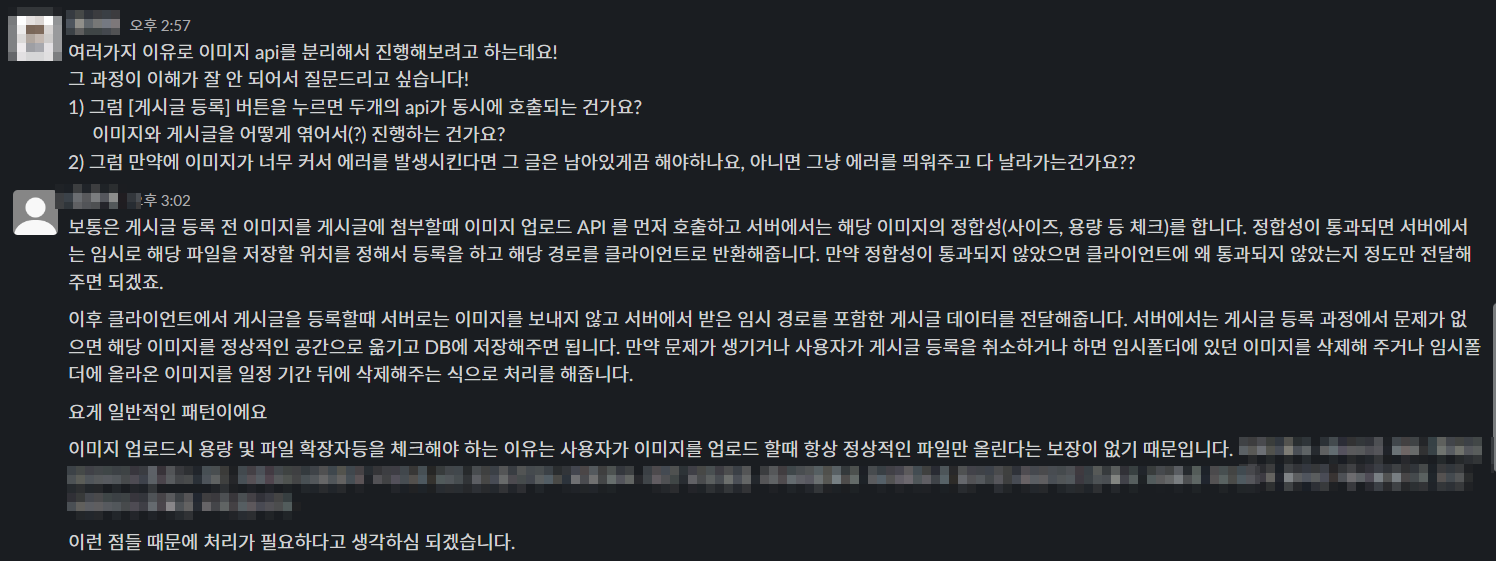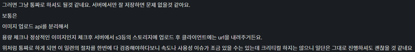 - 이미지를 포함한 게시판 기능을 계속해서 개발하던 중에 프런트 팀과 이야기를 나누게 되었는데 그 팀원의 의견은 다음과 같았다.