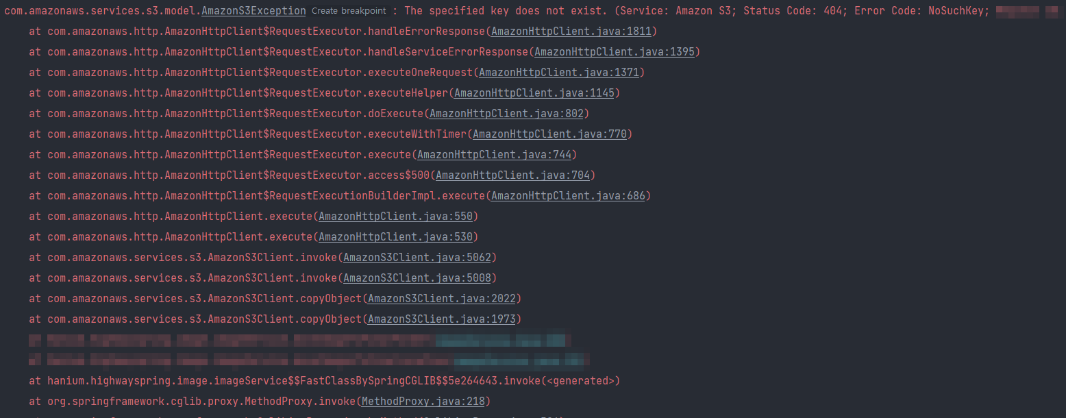 com.amazonaws.services.s3.model.AmazonS3Exception: The specified key does not exist. (Service: Amazon S3; Status Code: 404; Error Code: NoSuchKey; Request ID: --이 부분은 혹시 몰라 삭제--; S3 Extended Request ID: --이 부분은 혹시 몰라 삭제--=; Proxy: null), S3 Extended Request ID: --이 부분은 혹시 몰라 삭제--